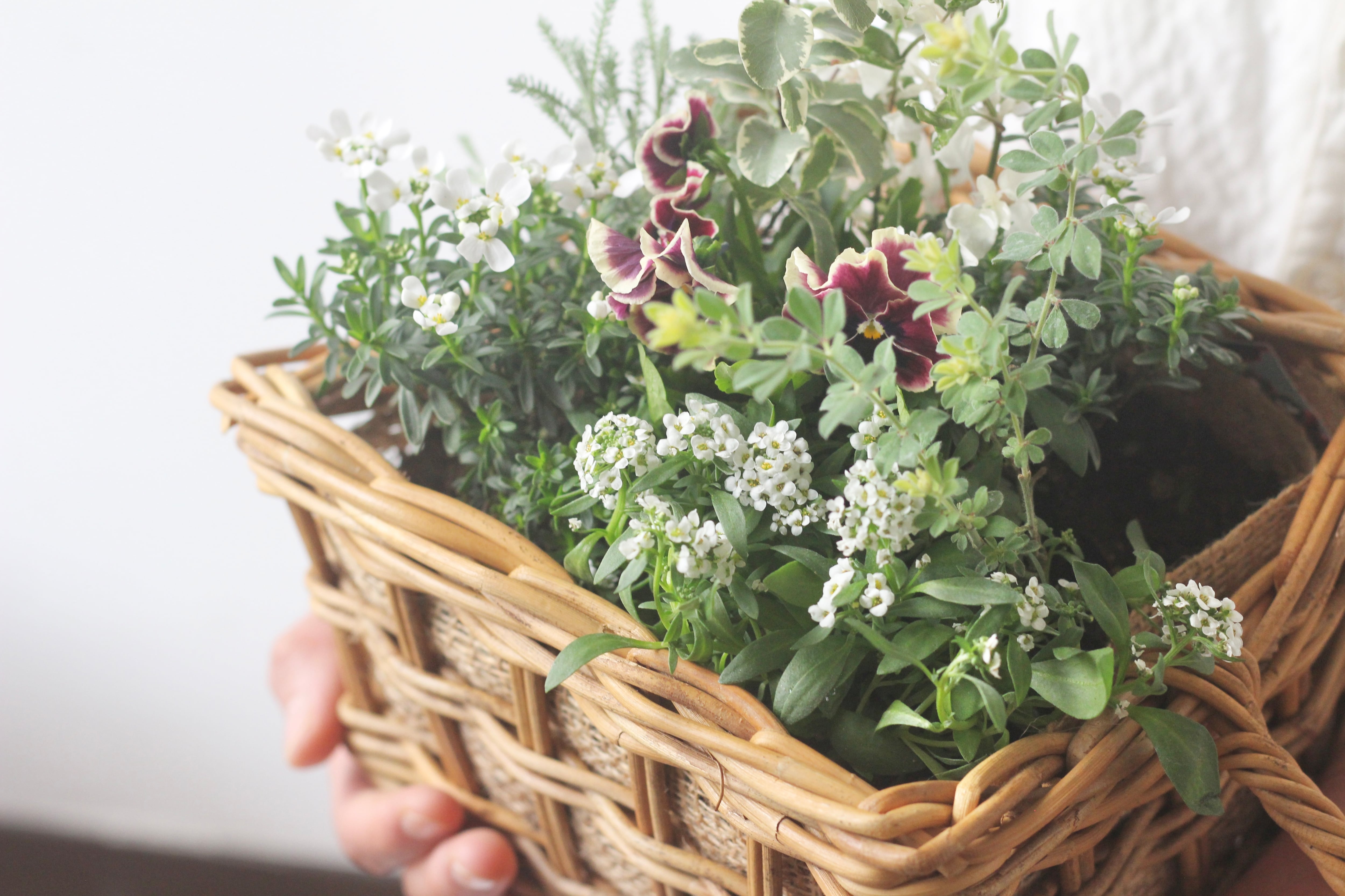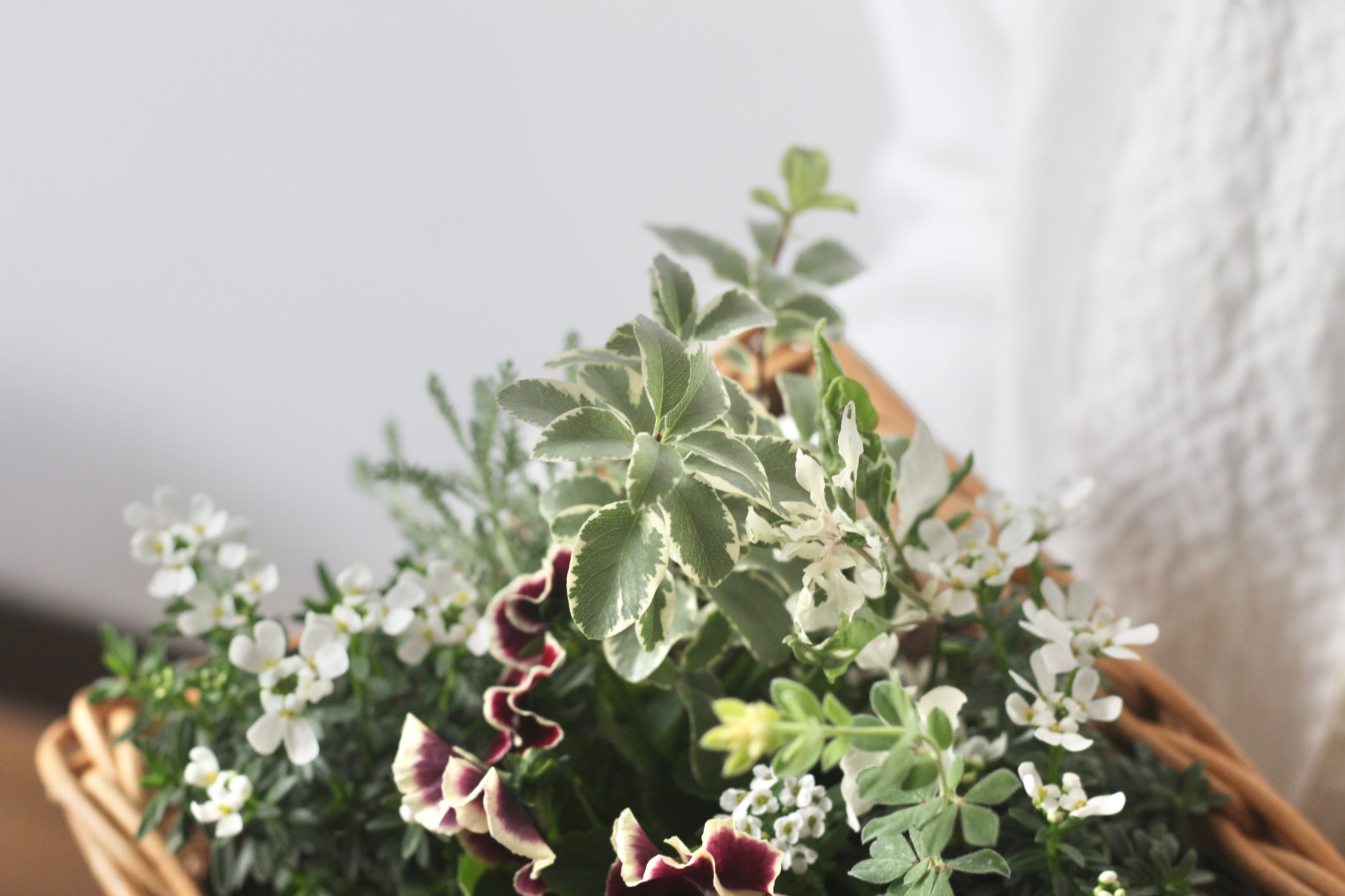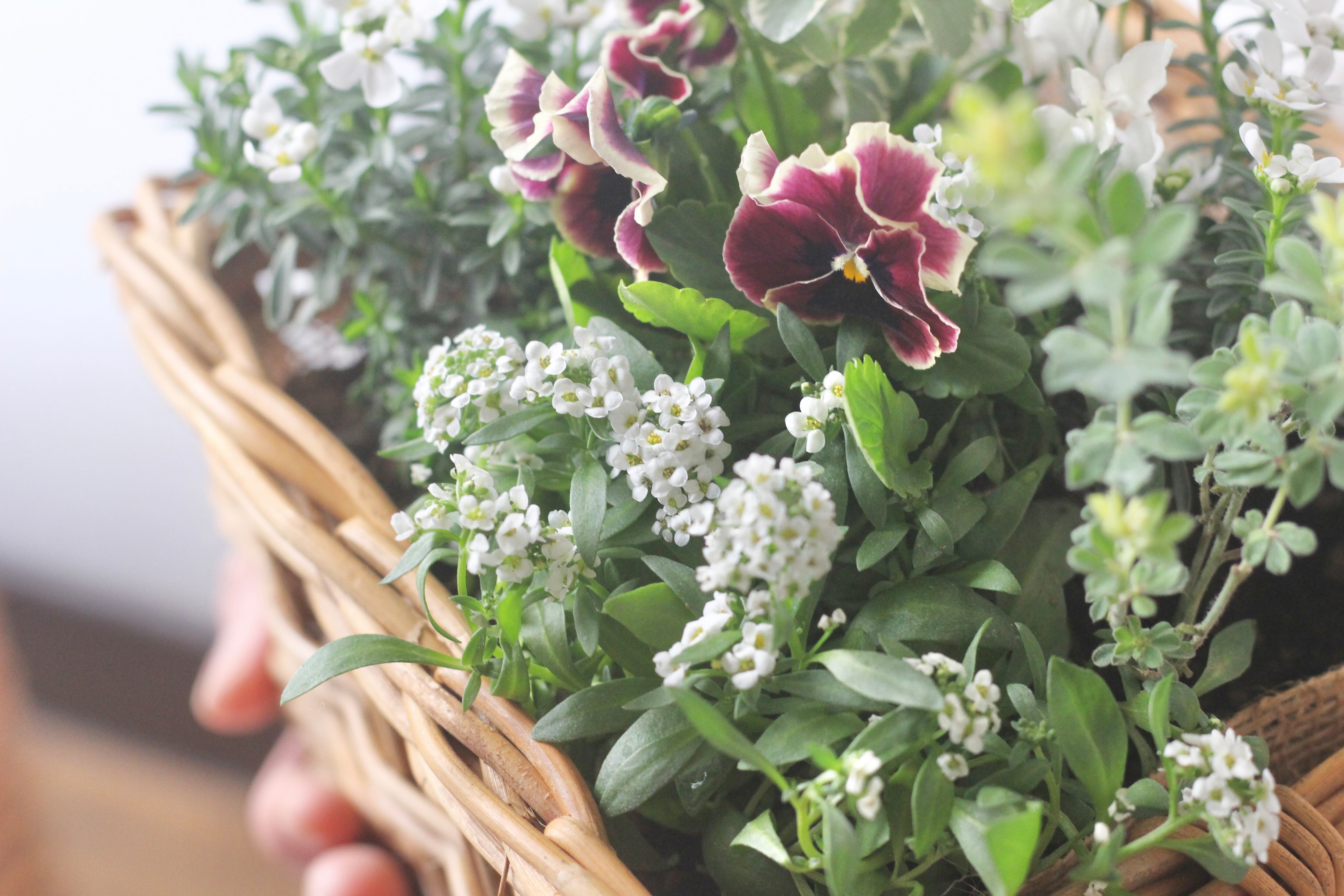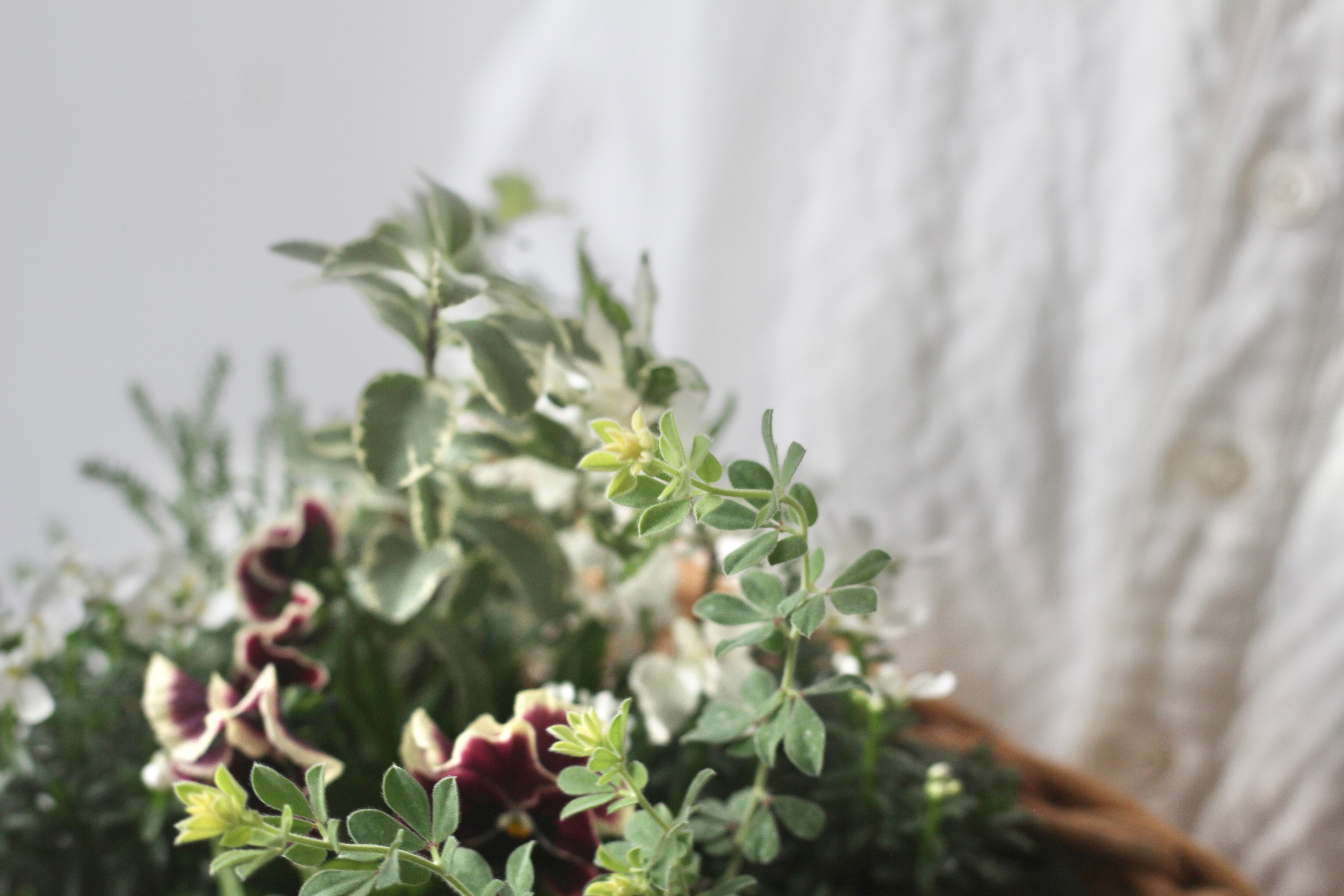ワインレッドの花色が可愛いらしい小輪パンジー「わらく」をメインに自然な雰囲気で、
