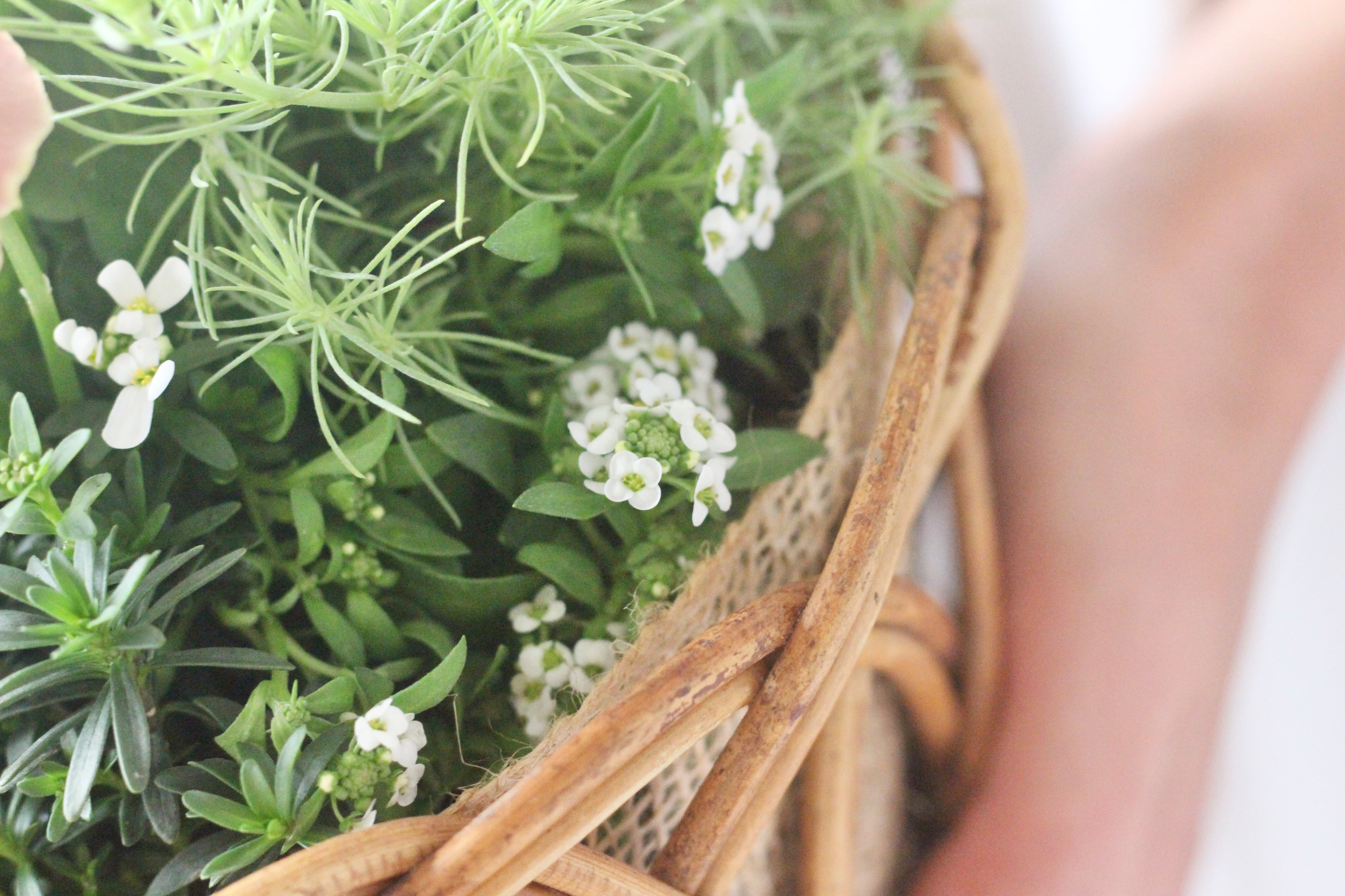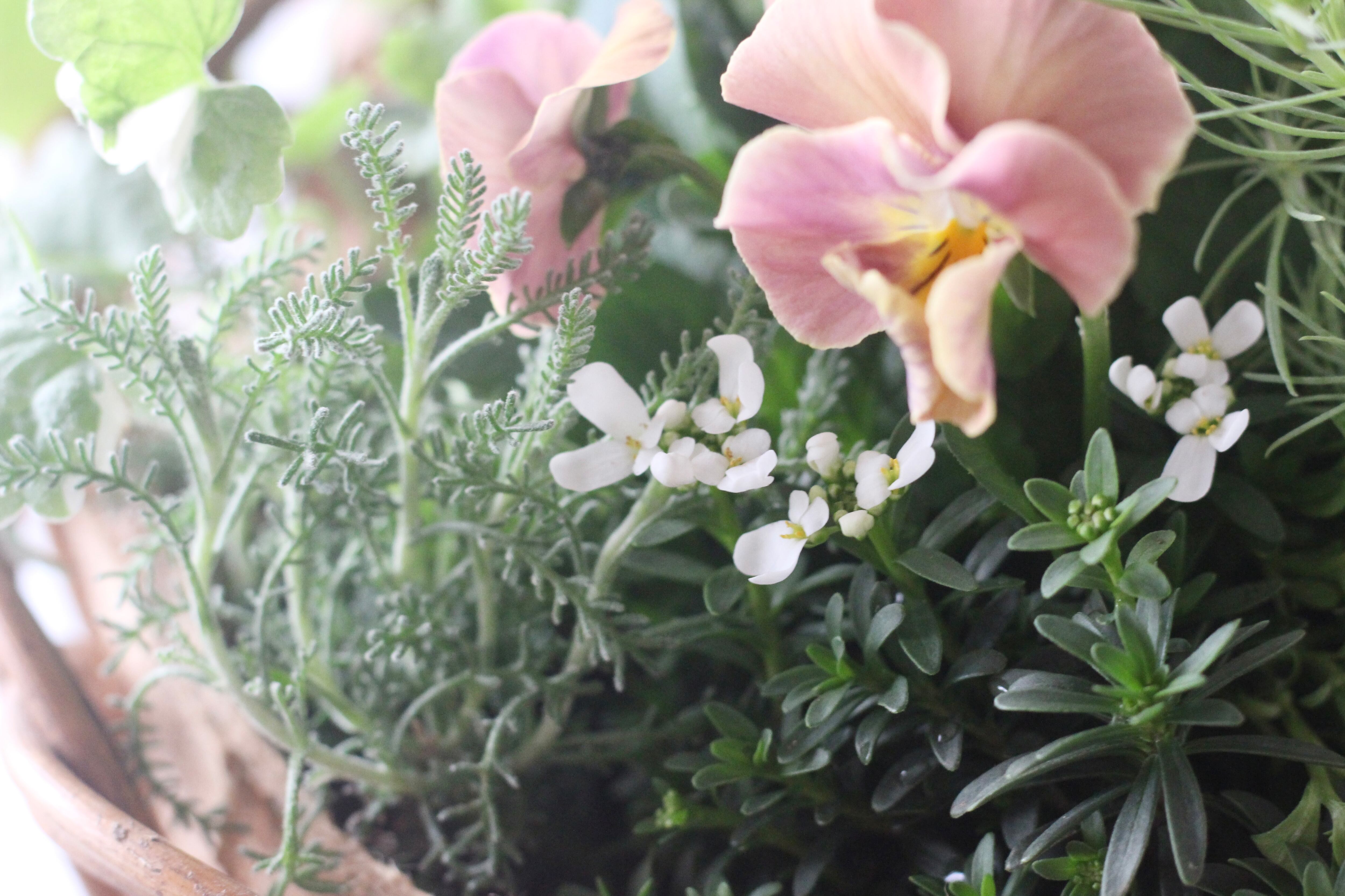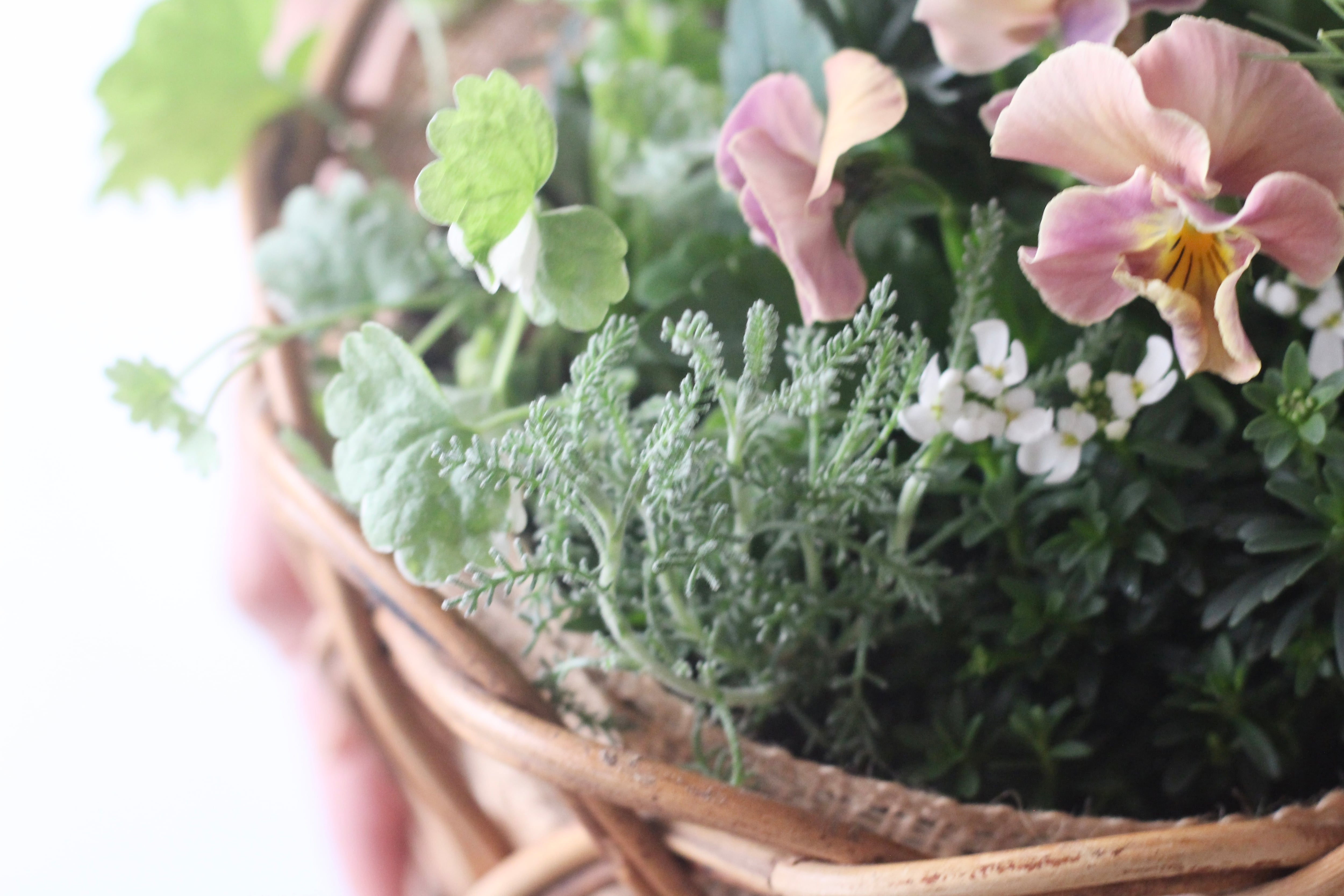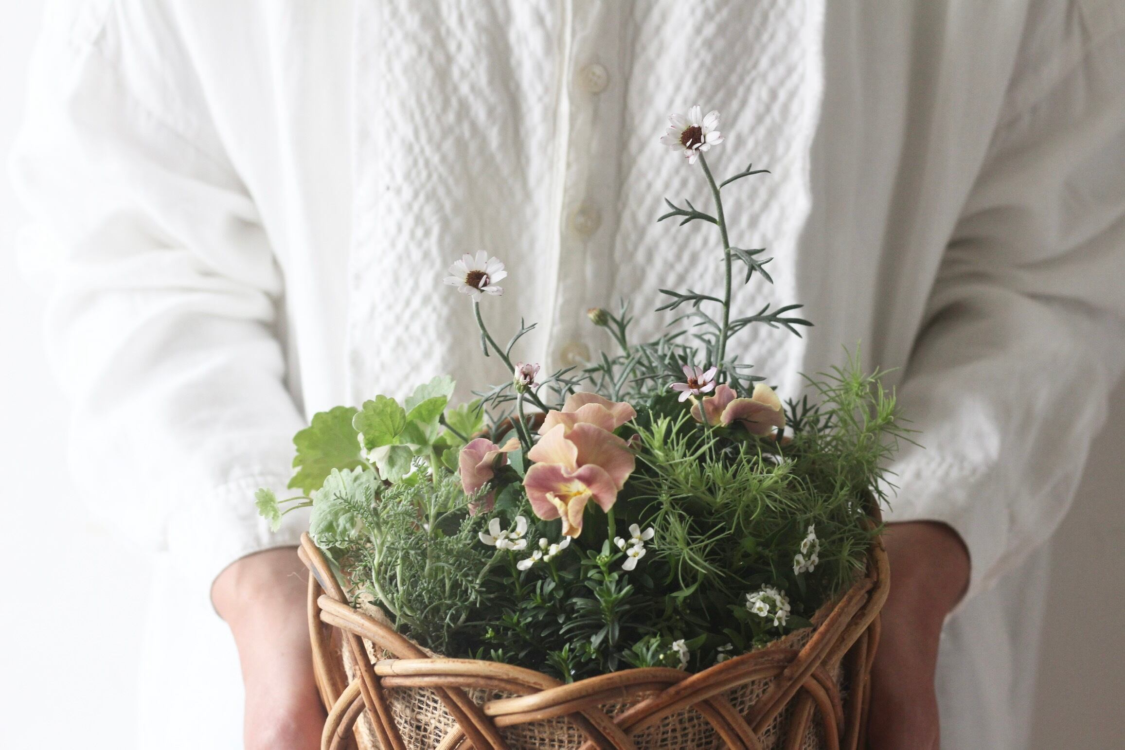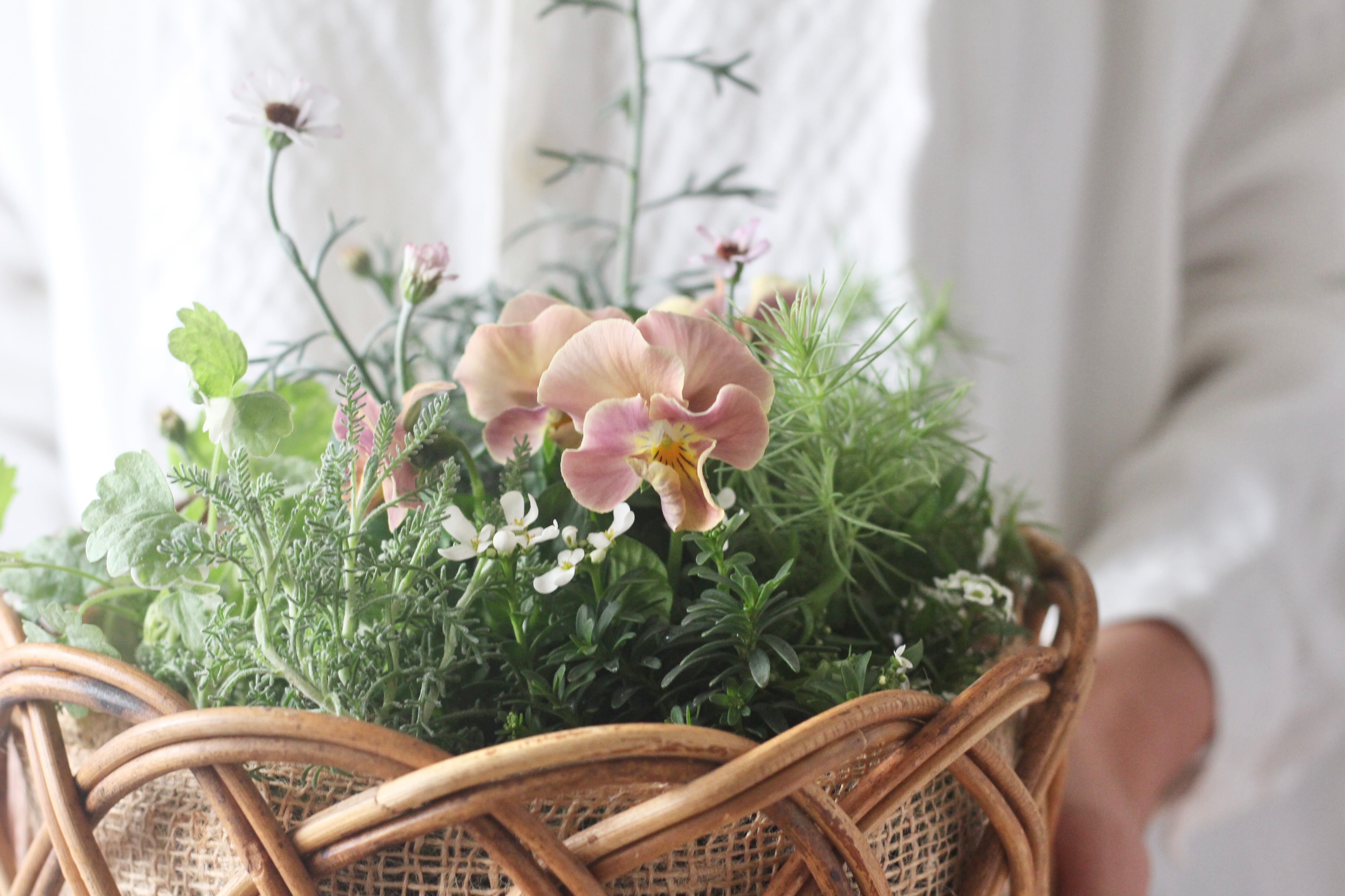 アプリコット色のフリルパンジー、白色のスイートアリッサム、など全7種類の植物を天然素材バスケットに植え込んであります。
