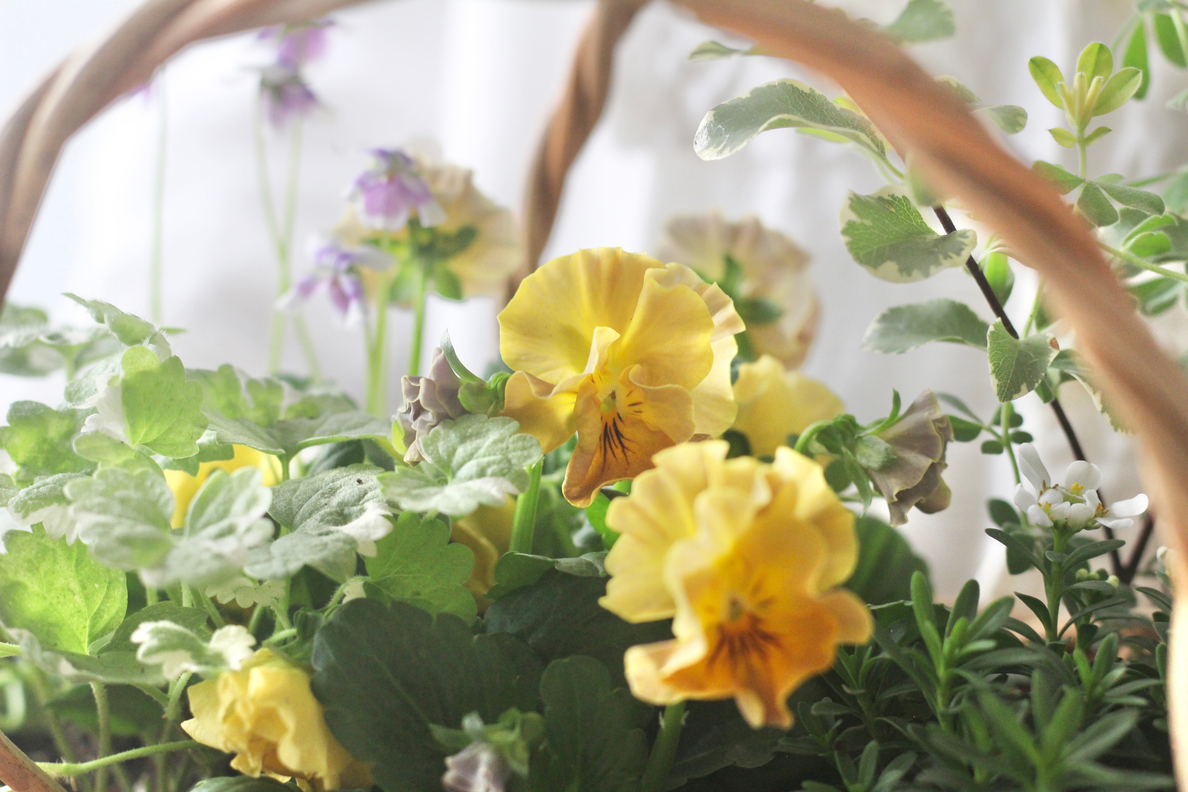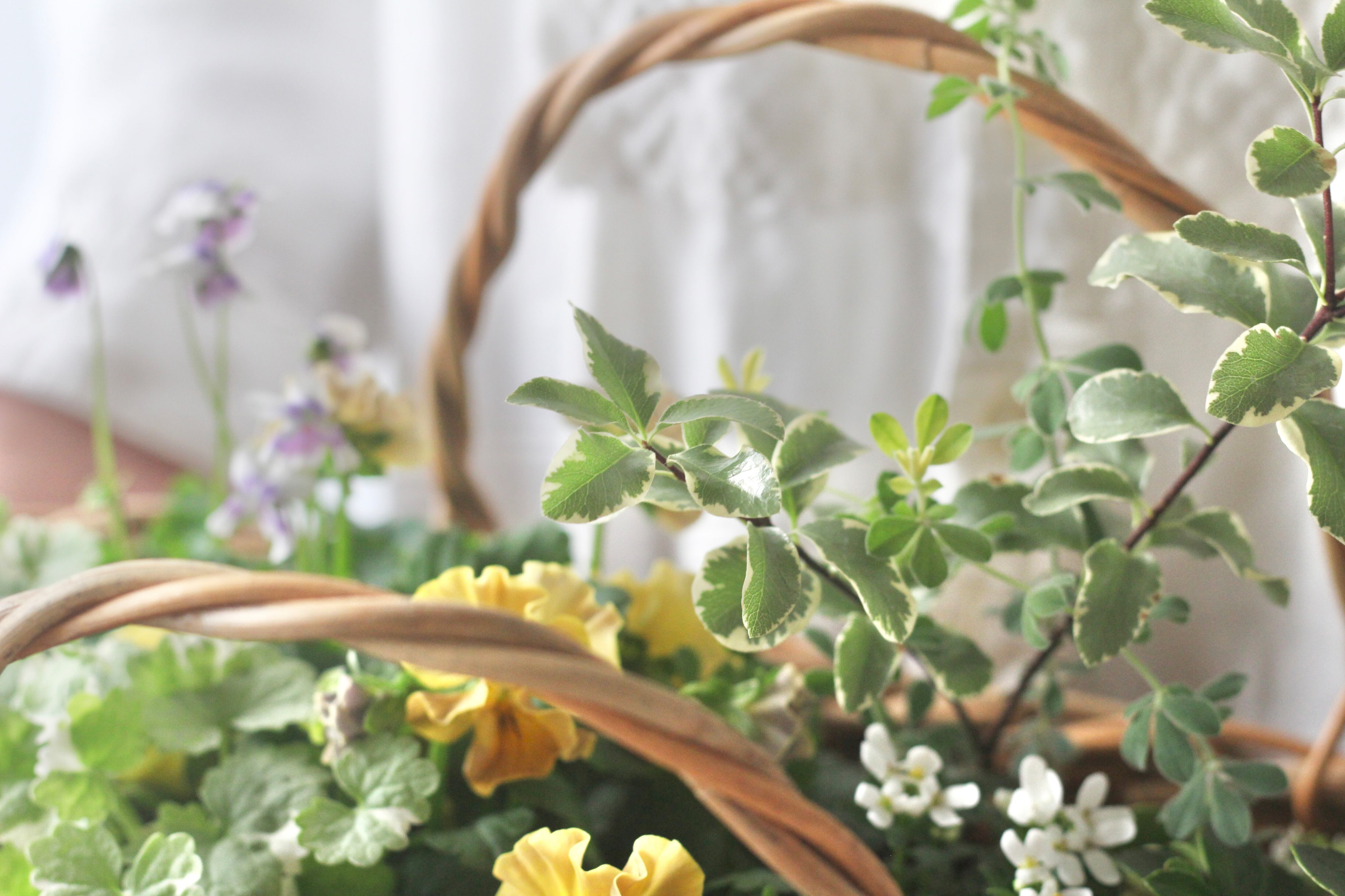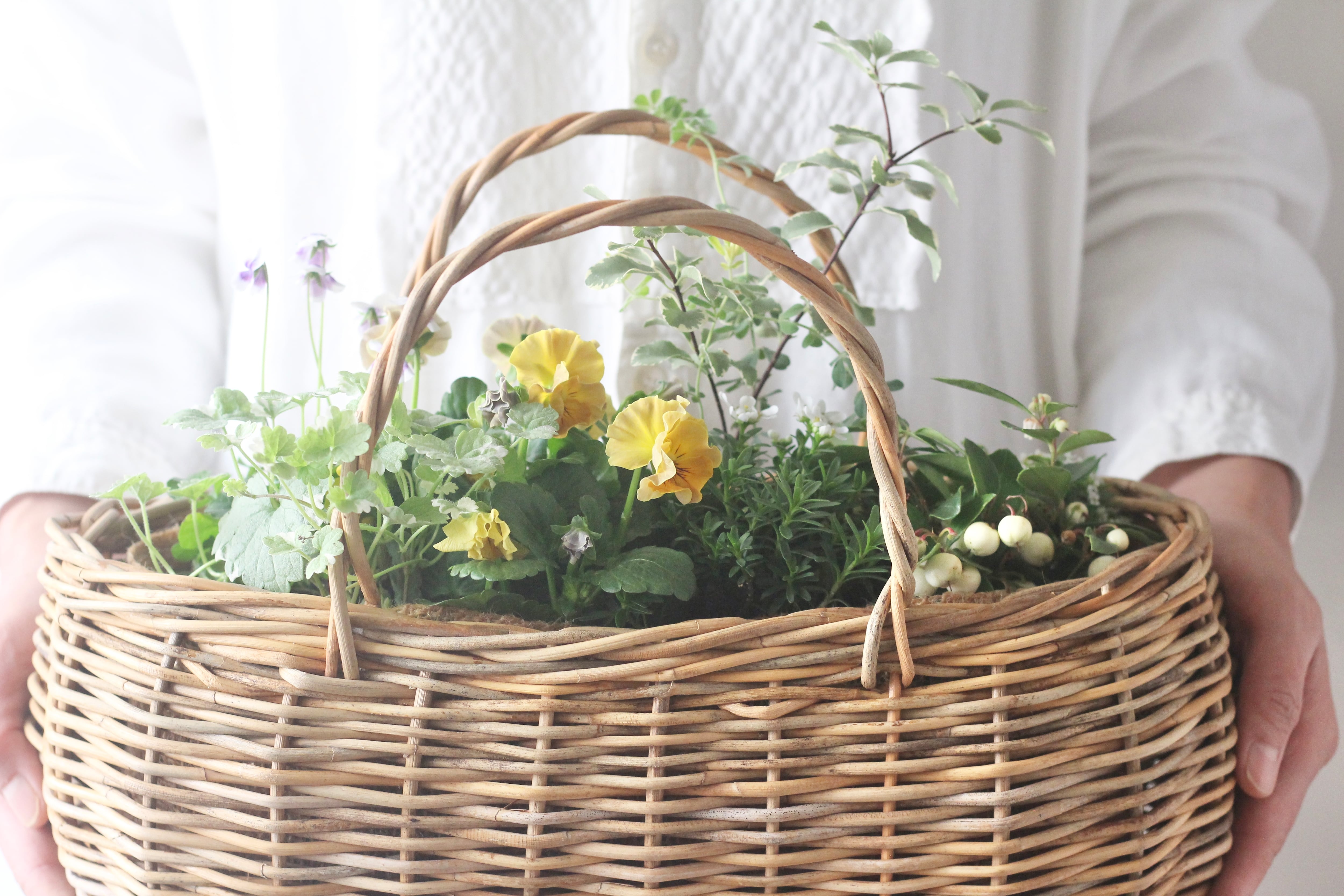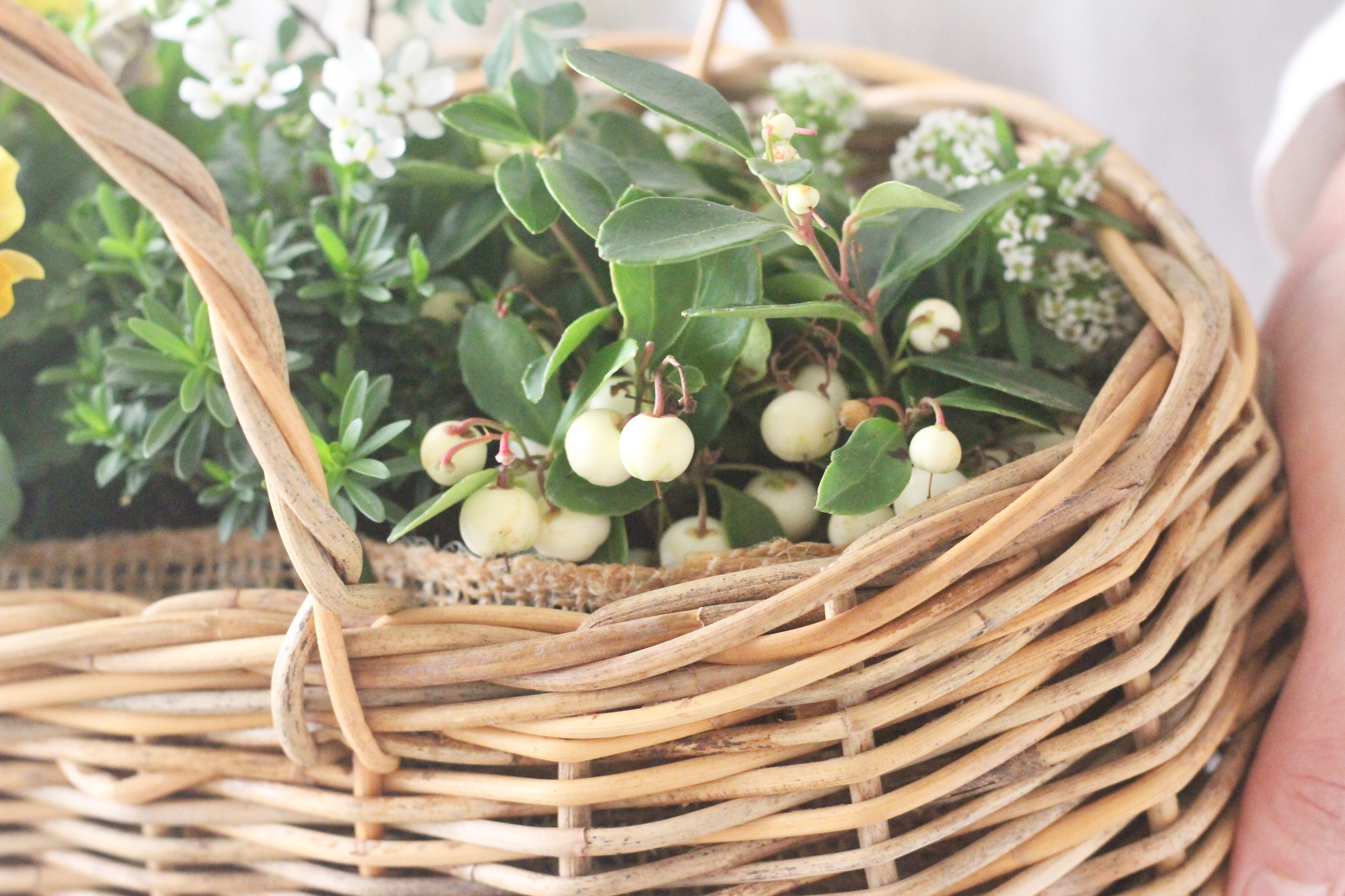 チェッカーベリーの白実も珍しく、色々な植物を楽しめる全7種類の植物を全然バスケットに植え込みました。