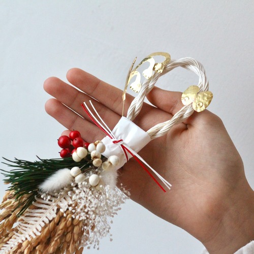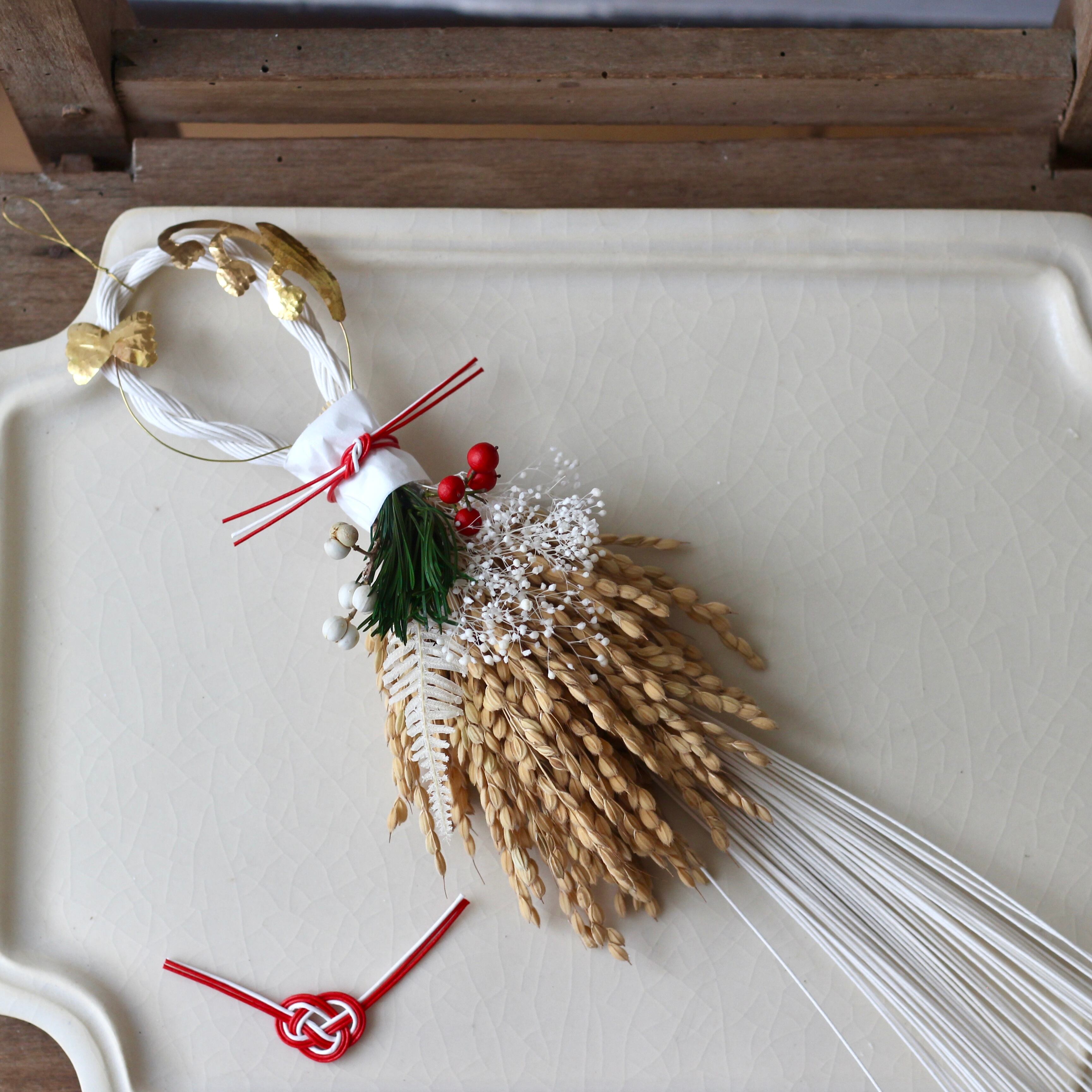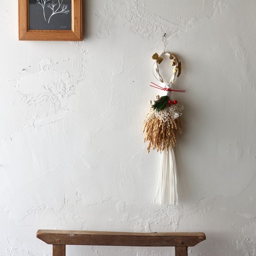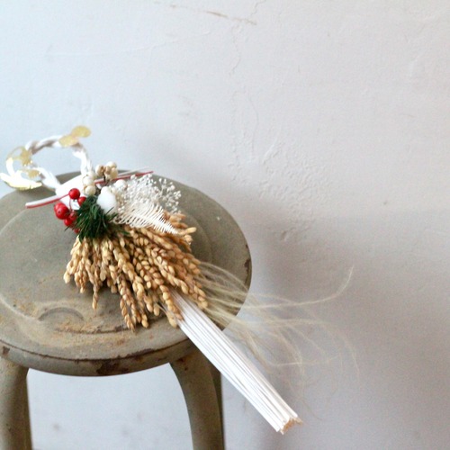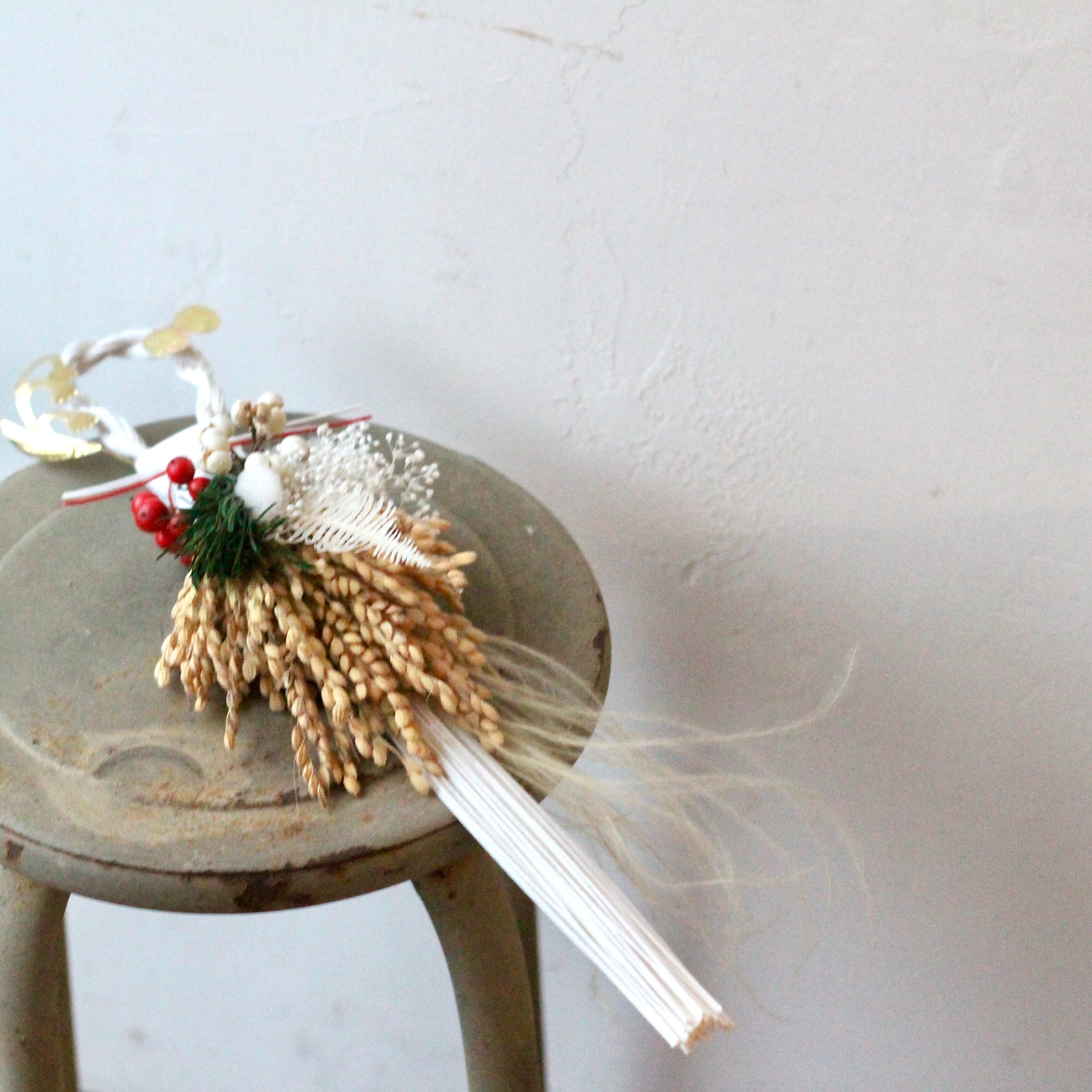 真鍮の飾りをポイントに、水引と稲穂をベースにしたすっきりとしたお正月飾りです。