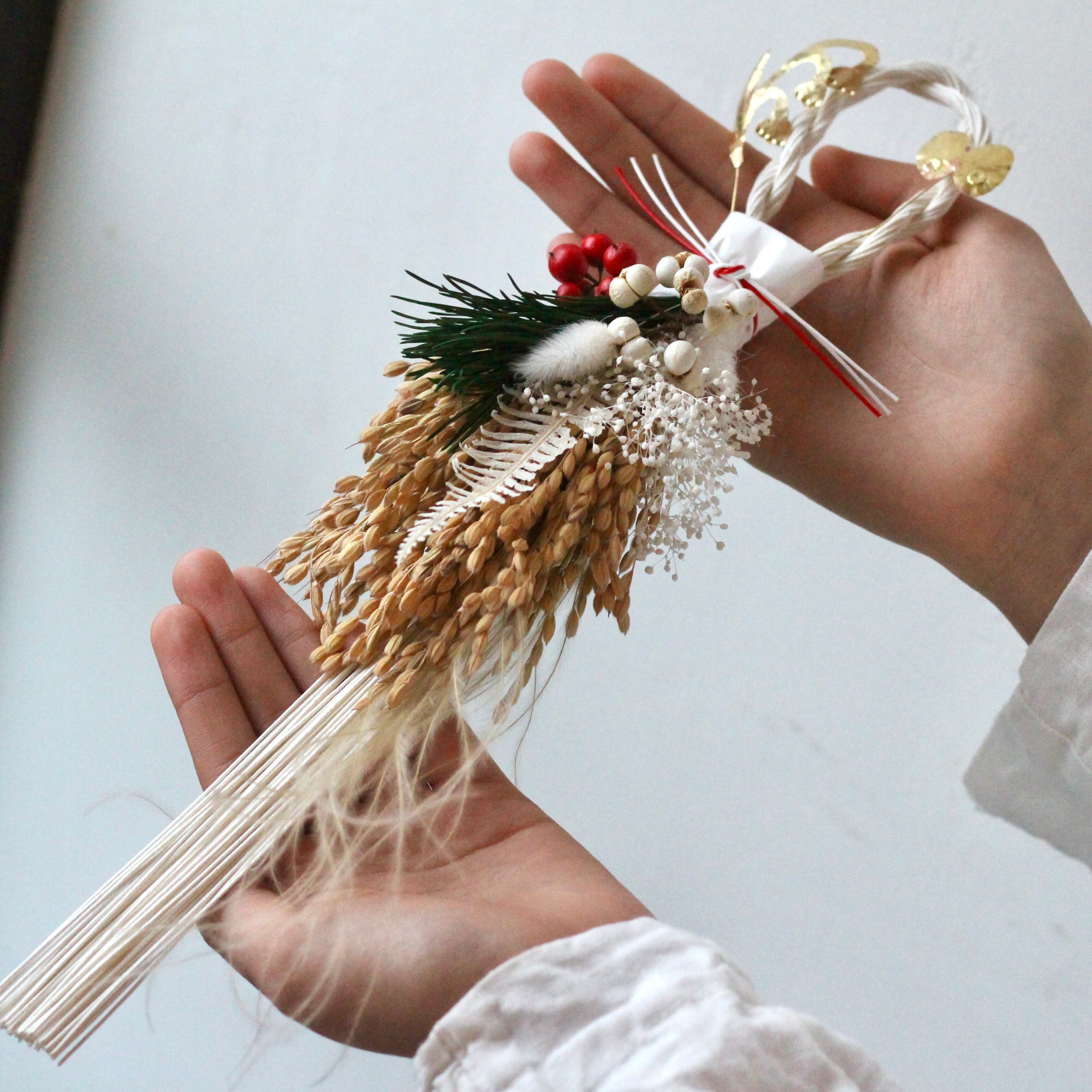 自然の植物、プリザーブド加工のドライフラワーなので、画像と多少違うところがあります。再販分は稲穂、松、カスミソウ、南天、ナンキンハゼの実は一緒ですが、他に花材をプラスしてますのでご了承ください。