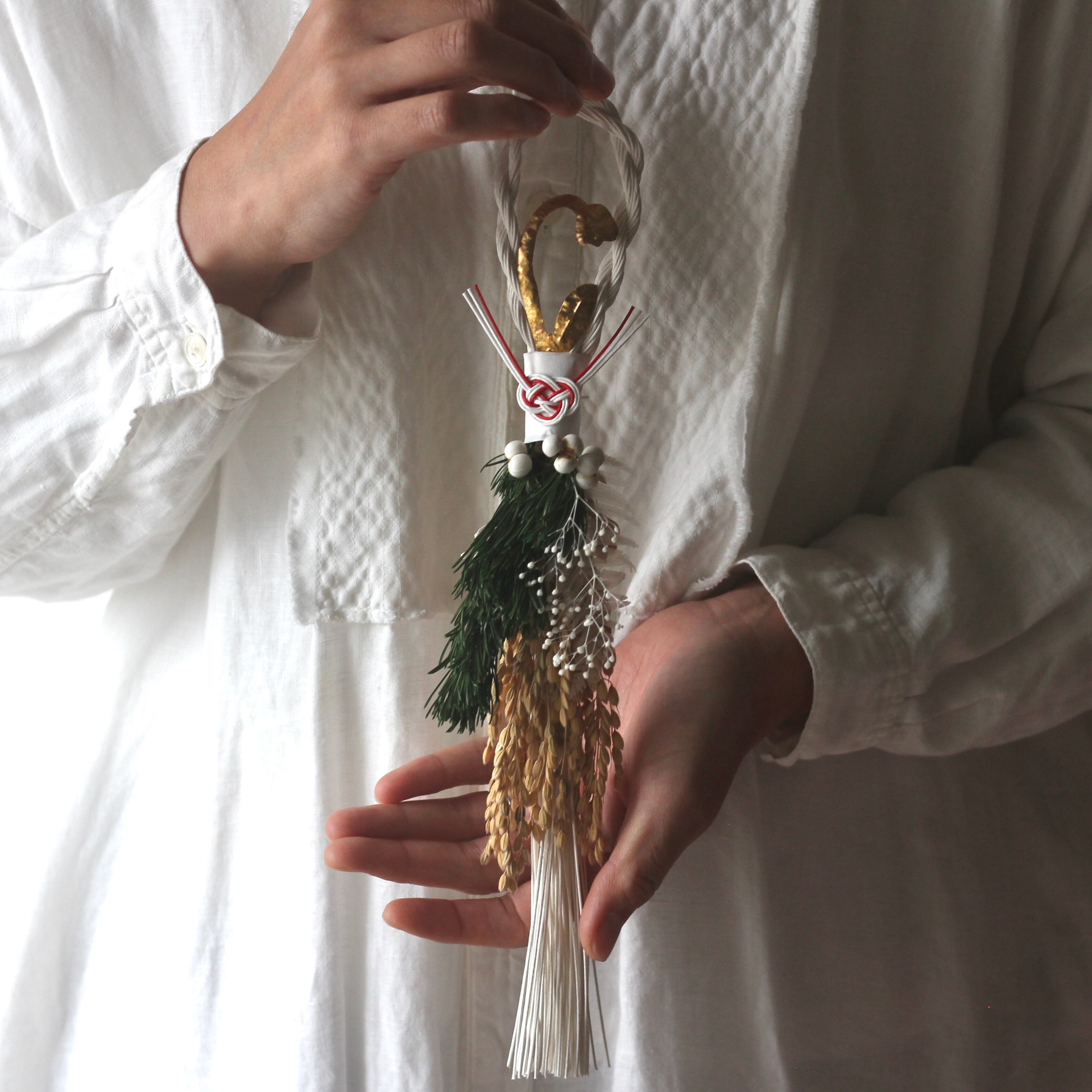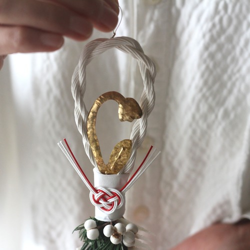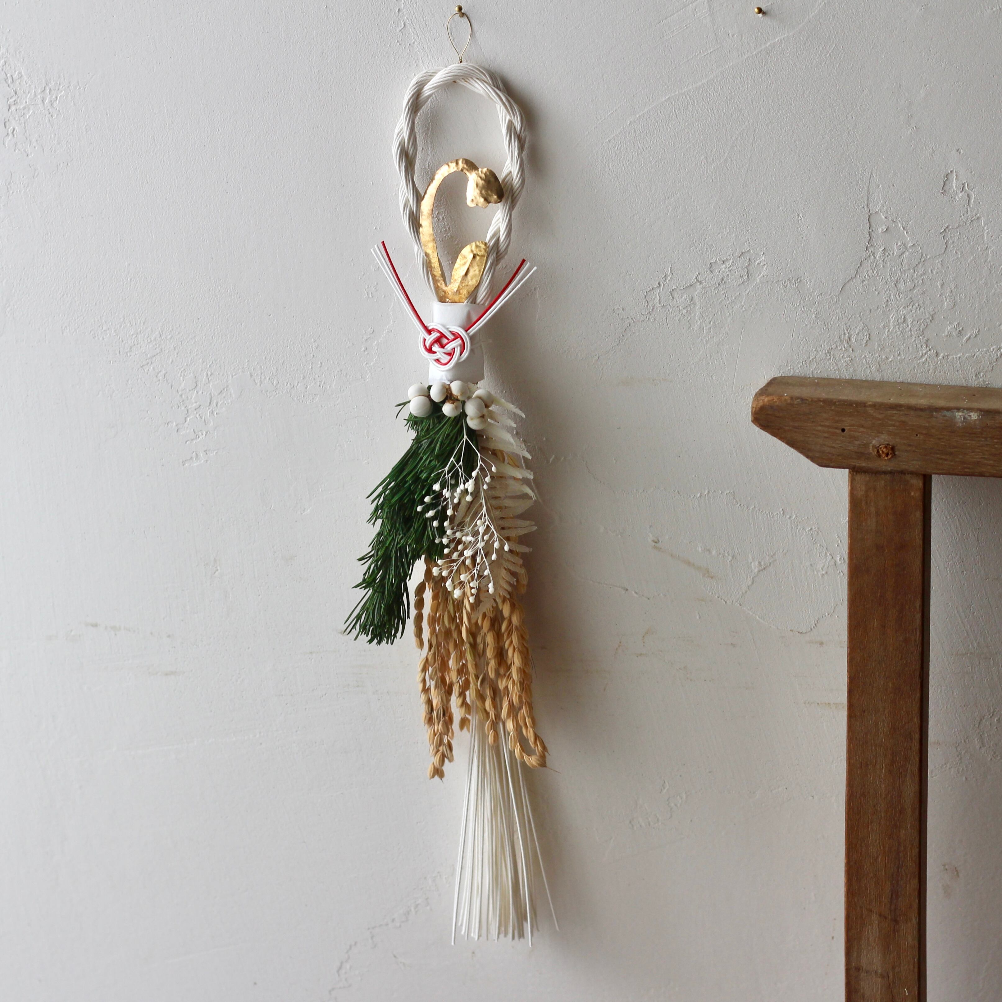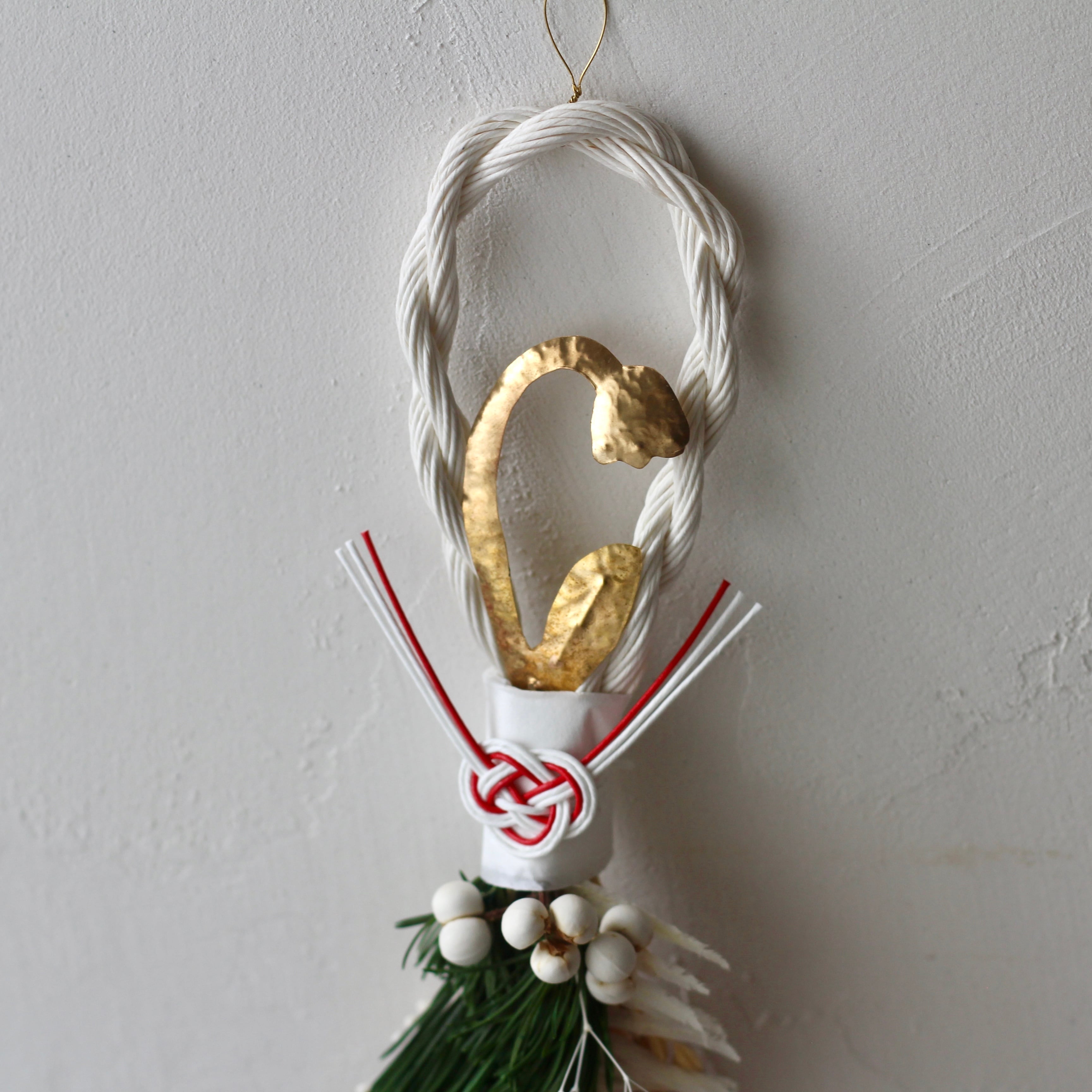 真鍮の飾りをポイントに、白い水引と稲穂をベースにしたすっきりとしたお正月飾りです。