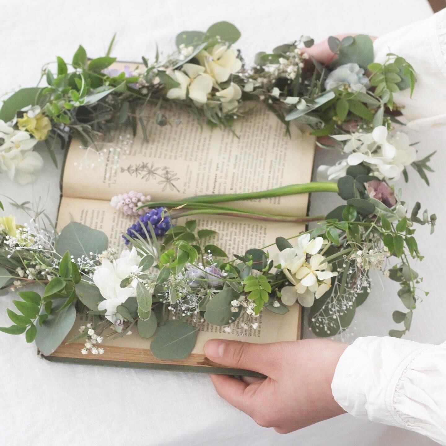 やわらかなグリーンと一緒に束ねた春のガーランドを作ります。